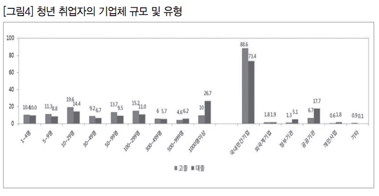 청년 취업자가 입사한 기업체 규모를 살펴보면, 고졸자는 10인~29인 규모의 기업체 비율이 19.6%로 가장 높았고, 대졸자는 1,000인 이상 규모의 기업체 비율이 26.7%로 가장 높았다. 청년 취업자가 입사한 기업의 유형을 살펴보면, 국내 민간기업이 절대적으로 높은 것으로 나타났는데, 고졸자의 비중이 대졸자보다 상대적으로 높게 나타났다. 대졸자의 경우 공공기관에 입사한 비율이 17.7%, 정부기관 5.1% 등으로 입사하는 기업체 유형이 고졸자보다는 다양한 것을 확인할 수 있다.