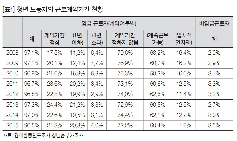통계청의 경제활동인구조사 청년층부가조사(이하 청년층부가조사)를 보면, 청년층(15~29세)의 고용률은 떨어지고 실업률은 올라가는 현상을 확인할 수 있다. 2004년 청년층 인구는 1,016만 명, 취업자는 460만 명이었으며, 2015년 청년층 인구는 950만 명, 취업자는 396만 명이었다. 청년층 인구는 66만 명이 줄었고 취업자는 64만 명이 감소했다. 고용률로 보면 2004년 45.2%에서 2015년 41.7%로 3.5% 포인트 하락했다. 반면, 실업자는 2004년 41만 명이었는데 2015년에도 41만 명이다. 실업률은 2004년 8.1%에서 2015년 9.3%로 1.2% 포인트 올라갔다. 실업자 수는 변함이 없는데 실업률이 올라간 것을 알 수 있다. 이 지표를 불안하게 보는 이유는 취업자는 감소했는데 실업자는 변함이 없기 때문이다. 게다가 비경제활동인구마저 10년째 같은 수준을 보인다는 점도 위험을 알리는 징표다. 비경제활동인구는 2004년 516만 명이었는데 2015년에도 513만 명이다. 10년 동안 겨우 3만 명 줄었다. 즉, 이른바 ‘백수’라 불리는 청년 수가 여전하다는 말이다. 그렇다면 실업자와 백수인 청년들이 왜 줄지 않느냐는 의문이 든다. 답은 간단하다. 기업들이 청년고용을 줄였기 때문이다. 이런 분석은 고용의 양만 늘리면 해결된다는 식으로 결론이 도출되기 마련이다. 그래서 청년 실업문제를 좀 더 깊이 들여다보기 위해서는 고용의 질적인 면도 살펴야 한다.