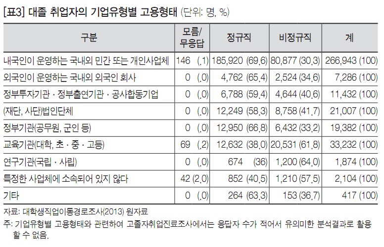 청년 노동자들이 취업한 기업의 유형별로 고용형태를 살펴보면, 교육기관과 연구기관에서 비정규직으로 취업한 비율이 가장 높았고, 민간기업과 정부기관의 비정규직 비율이 상대적으로 낮았지만, 여전히 30%대를 넘는 비율을 보이고 있다. 정부투자기관과 법인단체에서도 비정규직 비율이 각각 40.6%, 41.7%로 높게 나타났다. 비정규직 비율이 높게 나타난 회사들은 공공부문 성격이 짙은 곳이다. 이 회사들은 상대적으로 임금과 고용이 안정된 회사로 평가되는데 이런 곳에서 비정규직의 비율이 높게 나타나는 것은 문제다. 모범을 보여야 할 공공부문에서 불안정한 일자리 비중이 높다는 것은 정부의 정책 방향을 의심하게 하는 대목이다.