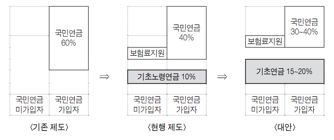 ‘기초연금 인상’은 두 단계를 거칠 수 있다. 우선 급여율을 점차 15%(30만 원)로 올려야 한다. 그러면 공적연금 체계가 국민연금 40%, 기초연금 15%로 구성되는데, 이는 노무현 정부 당시 민주노동당이 주창한 방안이다. 더 나아가 기초연금을 20%(40만 원)로 더 올릴 수 있다면 국민연금 급여율은 30%로 낮출 수 있다. 가입기간을 감안한 실질급여액을 비교하면 국민연금의 명목급여율 10%는 기초연금의 5%와 비슷하기에, 양 급여율의 재구조화는 실질연금액의 하후상박 효과를 낳게 된다. 또한 당해 세대가 책임지는 기초연금의 몫이 늘어나고, 후세대로 이연(移延)되는 국민연금의 몫이 작아지므로 세대별 재정부담의 형평성도 개선되고, 연착륙 가능성도 커진다.