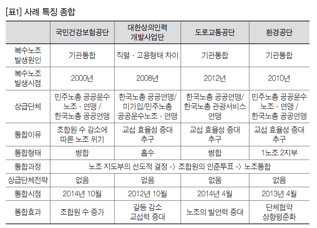 4개 사례들을 종합적으로 검토하면 주요 특징은 다음과 같다. 첫째, 복수노조통합의 핵심적인 이유는 대체로 내부 요인인 노조 위기극복과 교섭효율성 증대 때문이었다. 건강보험공단의 경우 주된 통합 이유는 신입직원 노조 미가입, 고령직원 퇴직에 따른 조합원 수 감소가 결정적인 계기가 되어 조직위기를 피하기 위한 것이었다. 대한상의인력개발사업단 사례는 복수노조 유지의 편익(복수노조별로 자기에게 유리한 단체협약 체결)보다 비용(복수노조 유지를 위한 다양한 비용)이 더 커서 실익이 없기 때문에 실익을 찾기 위한 것이었다. 도로교통공단 사례에서 통합의 가장 큰 이유는 통합해서 노조 힘을 합치자는 것이었고 과반수노조가 대표교섭을 할 때보다 공동교섭을 할 때가 더 좋았던 경험, 즉 교섭효율성 증대에서 통합 이유를 찾아 볼 수 있다. 환경공단 사례는 노동조건 통일, 그리고 노동조건 향상을 위해 사측과 교섭을 잘 하기 위해서 노조 내부 조율이 필요하다는 데서 노조통합 이유를 찾고 있다. 즉 이들 사례에서는 크게 둘로 나누어 노조 조직위기 극복(건강보험공단 사례)과 교섭 효율성 증대(대한상의인력개발사업단, 도로교통공단, 환경공단 사례)를 노조통합의 이유로 들고 있다.