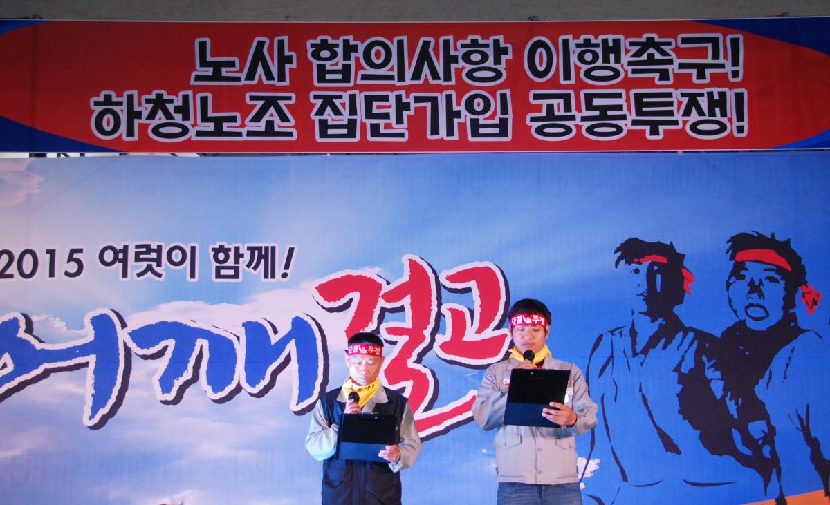 (사진: 현대중공업 원하청노조 간부들이 5월14일 하청노조 집단가입 공동투쟁 결의대회에서 ‘2015 공동투쟁 결의문’을 낭독하고 있다. ⓒ현대중공업 노동조합)