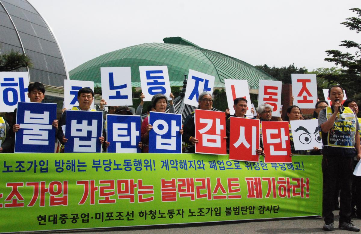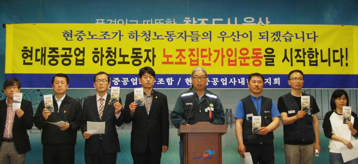 현대중공업에는 약 4만 명의 사내하청노동자들이 일하고 있다. 대법원은 원청 사용자성을 인정한 바 있지만, 현대중공업은 그동안 하청노동자들의 노동조건을 제대로 개선하지 않았다. 하청노동자들의 임금은 원청에서 내려주는 공수(工數)에 따라 차등으로 지급되고, 이 외의 각종 노동조건은 그저 하청업체 업주가 정한대로 받아야만 했다. 그뿐만이 아니라 고용은 매우 불안정해서 원청에서 계약해지하면 하루아침에 일자리를 잃어야 하는 처지에 놓여있었다. 이러한 불안정고용조건, 저임금과 장시간노동, 형편없는 후생 복지 등으로 인해 아무리 오랜 기간 동안 일을 해도 하청노동자들의 삶은 개선되지 않았다. 특히 최근 들어 더욱 확대된 다단계 하청구조는 진짜 사용자가 누구인지 알 수 없을 정도로 복잡해졌다. 하청노동자의 노동조건은 더욱 열악해지고 있는 실정이다. 복잡한 고용구조로 원청이 책임져야 할 산업안전관리는 허술해질 수밖에 없고, 하청노동자들은 산업재해에 고스란히 노출되어 있다. 이로 인해 지난 한 해 현대중공업에서는 9명의 하청노동자가 죽어 나갔고 올해도 벌써 2명의 사내하청노동자가 죽었으며 산재은폐 사례도 빈발하다. 이런 문제를 해결해 나가기 위해 지난해 현대중공업노조와 현대중공업사내하청지회가 공동으로 ‘사내하청 노동환경 실태조사’를 진행했다. 그 결과, 하청노동자 78.7%가 노동조합에 가입할 의향이 있다고 답했지만 75.7%는 해고와 블랙리스트가 두려워서 노조에 가입하지 못하고 있다고 답했다. 또한 노동조합에 가입하게 되면 가장 하고 싶은 것으로 임금·단체협약 체결 및 임금인상, 고용안정 보장을 꼽았다. 이러한 내용을 바탕으로 현대중공업노조는 지난해 임·단협 과정에서 이 문제를 논의하려 했으나 현대중공업 회사 측은 이런저런 핑계로 회피했고, 사내하청노조도 작년에 12개 업체와 수차례의 공식 교섭을 진행했지만 아직까지 단 한 업체와도 기본적인 협약조차 합의하지 못했다. 오히려 임·단투 과정에서 발생한 조합원 해고와 계약해지의 탄압에 맞서 계속 투쟁해야만 했다.