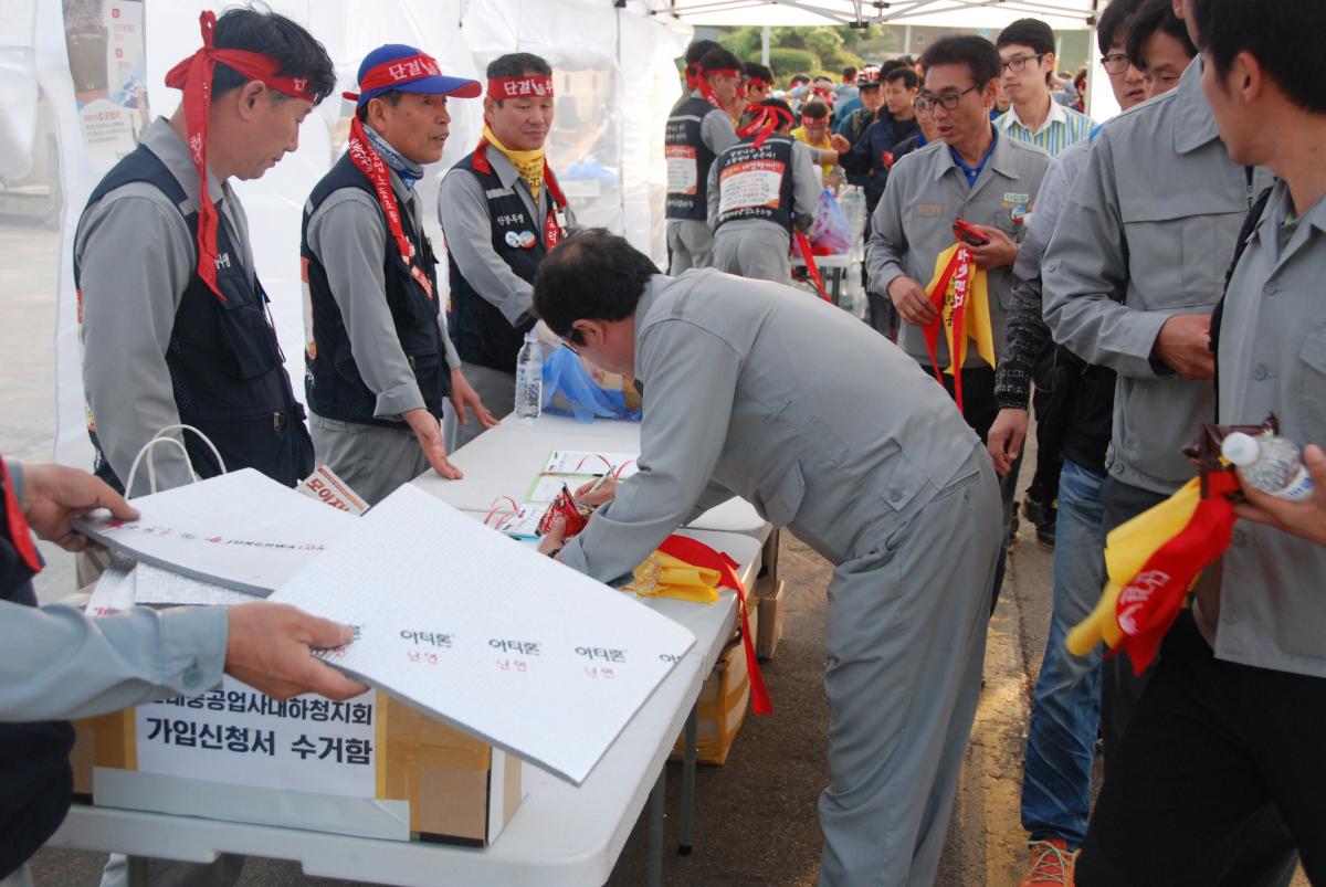 그렇지만 원·하청 공동투쟁의 기대를 안고 투쟁했던 사내하청 쟁의대책위원들이 장기 노숙농성으로 지쳐갈 무렵인 올해 초에 원·하청의 노조 대표자들이 만나 다시 한 번 투쟁의 기운을 만들어보자고 합의했고, ‘주간 정책협의회’를 통해 꾸준히 사업을 준비하고 진행하기로 했다. 이 ‘주간정책협의회’에는 민주노총 울산지역본부를 중심으로 한 ‘조선사업장 사내하청노동자 권리찾기 사업단’의 집행단위도 함께하고 있다. 현대중공업노조는 우선 사내하청노조의 재정에 도움을 주고 원·하청 공동투쟁을 위한 특별예산을 임시대의원대회에서 결의했다. 그리고 각종 선전물과 교육을 통해 원·하청 공동투쟁의 당위성을 역설하면서 원·하청 노동자들을 설득했다. 또한 현대자동차, 현대제철 등 타사의 사내하청 조직화과정의 사례를 통해 효과적인 조직화 과정을 준비하고, 정규직 노조 대의원 간담회를 통해 가입운동에 대한 설명회를 진행했다.