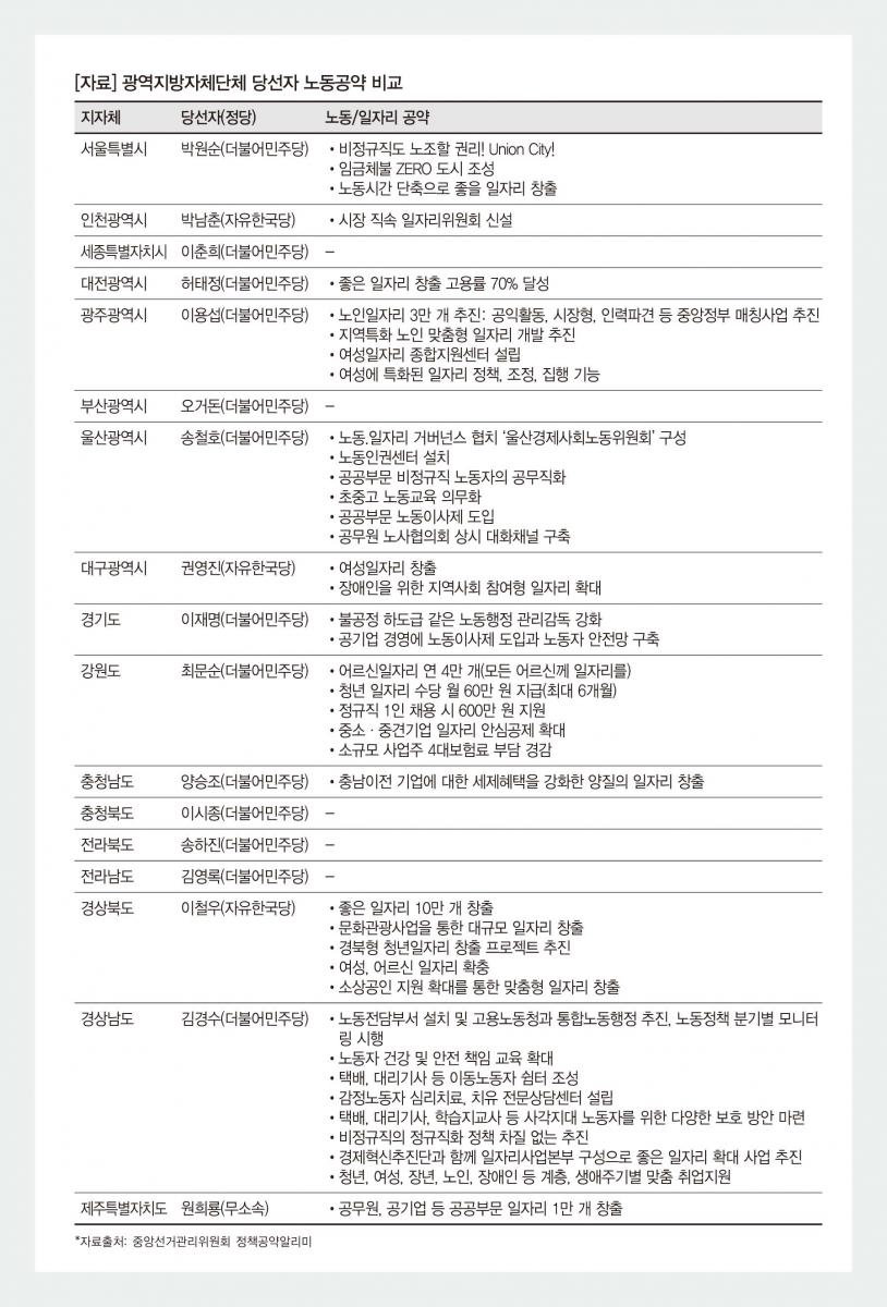 [자료] 광역지방자체단체 당선자 노동공약 비교