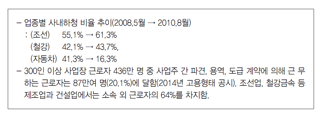 특히 유해·위험 작업을 직접 수행하지 않고 도급을 주는 아웃소싱이 일반화되는 추세로, 최근 사내 하도급 증가로 인한 하청노동자의 산재사망 등 산업재해가 지속적으로 증가하고 있다. ‘위험의 외주화’, ‘안전보건의 양극화’가 점점 심화되고 있는 것이다.