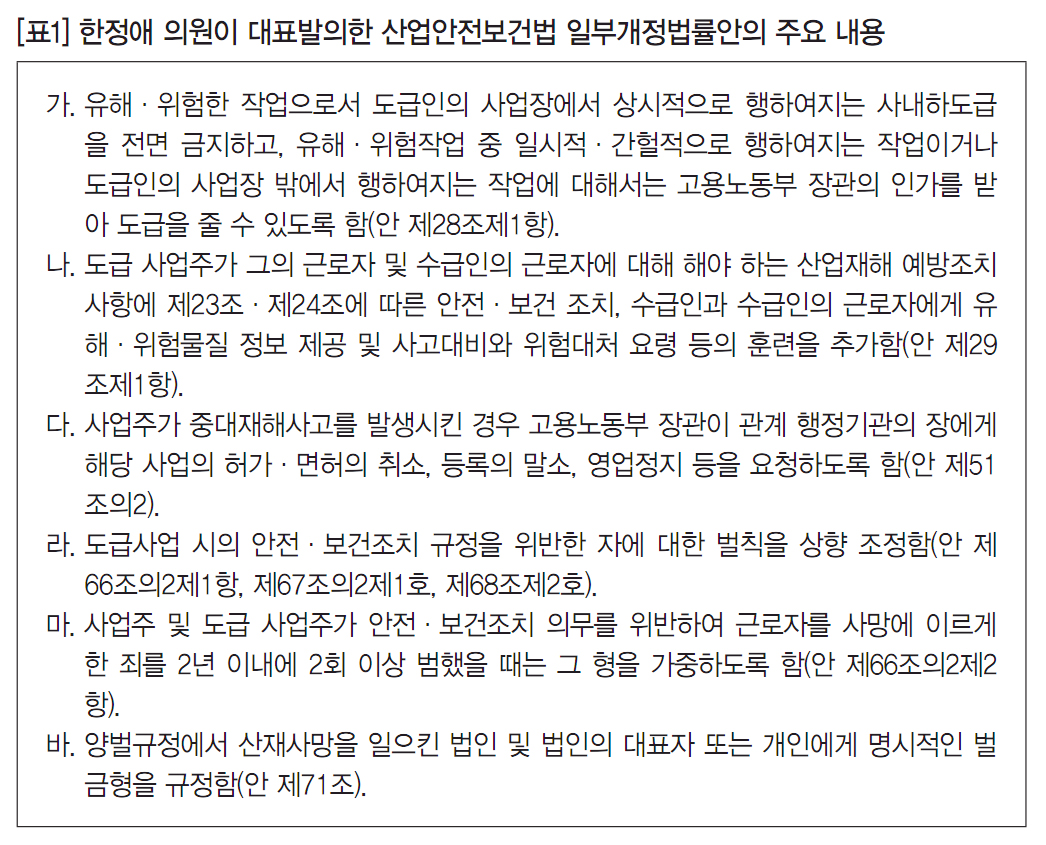 우리나라가 산재사망국가 세계 1위라는 오명에서 벗어나고, 하청노동자들이 생명과 안전의 문제에서조차 차별받고 있는 현실에서 벗어나기 위해서는 한정애 의원이 발의한 산업안전보건법 일부개정법률안과 같이 유해․위험한 작업으로서 도급인의 사업장에서 상시적으로 행해지는 사내하도급을 전면 금지하여야 한다.