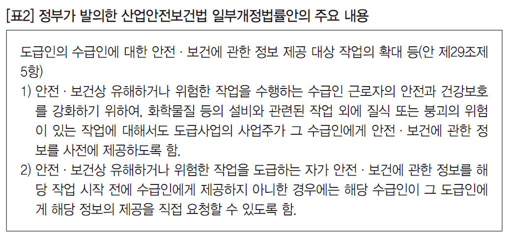 그러나 현실적으로 한정애 의원이 발의한 법률안이 통과될 가능성은 매우 낮아 보인다. 유해․위험한 작업으로서 도급인의 사업장에서 상시적으로 행해지는 사내하도급을 전면 금지하는 안에 대해 경영계가 강하게 반발하고 있고, 정부 또한 사내하도급 금지에 대해 상당히 부담스러워하고 있기 때문이다. 결국 정부가 발의한 산업안전보건법 일부개정법률안(의안번호 2004796)이 통과될 가능성이 높은데, 정부의 개정법률안 내용은 다음과 같다.