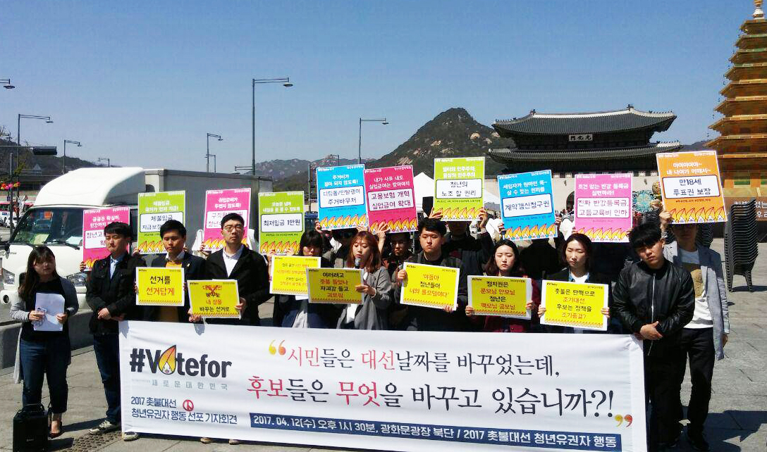 (‘2017 촛불대선청년유권자행동’은 4월12일 광화문광장에서 기자회견을 열고 각 정당 대선후보들에게 청년고용할당제 확대와 청년수당 전국화 등 청년정책 도입을 요구했다. ⓒ청년유니온)