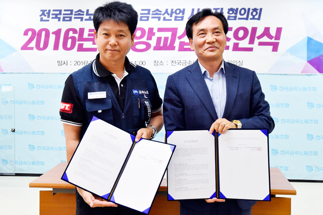 (김상구 금속노조 위원장과 신쌍식 금속산업사용자협의회장이 10월18일 2016년 중앙교섭 조인식을 마치고, 기념촬영을 하고 있다. ⓒ금속노동자 신동준)
