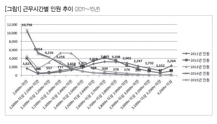 [그림1]을 보면 2,000시간 미만으로 근무하는 시급제 조합원의 숫자는 근무형태 변경 이후 큰 폭으로 늘어났다. 이를 2,200시간 미만으로 확대하면 2만 7천 명 중에 2만 명에 달할 정도로 변화는 상당하다. 이는 주‧야간을 합쳐 4시간이던 잔업이 1시간 정도로 감소하고, 주말의 15시간 야간 특근을 평일 노동으로 바꾼 결과이다.