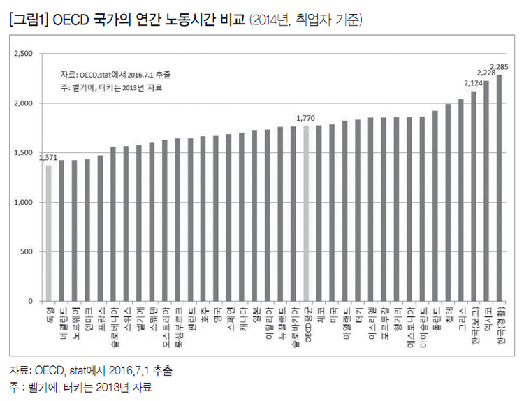 OECD 회원국 중 취업자 노동시간이 2천 시간을 넘는 나라는 한국(2,285시간)과 멕시코(2,228시간), 그리스(2,042시간) 세 나라뿐이다. 한국의 노동시간은 OECD 회원국 평균(1,770시간)보다 515시간 길고, 노동시간이 가장 짧은 독일(1,371시간)보다 914시간 길다([그림1] 참조).