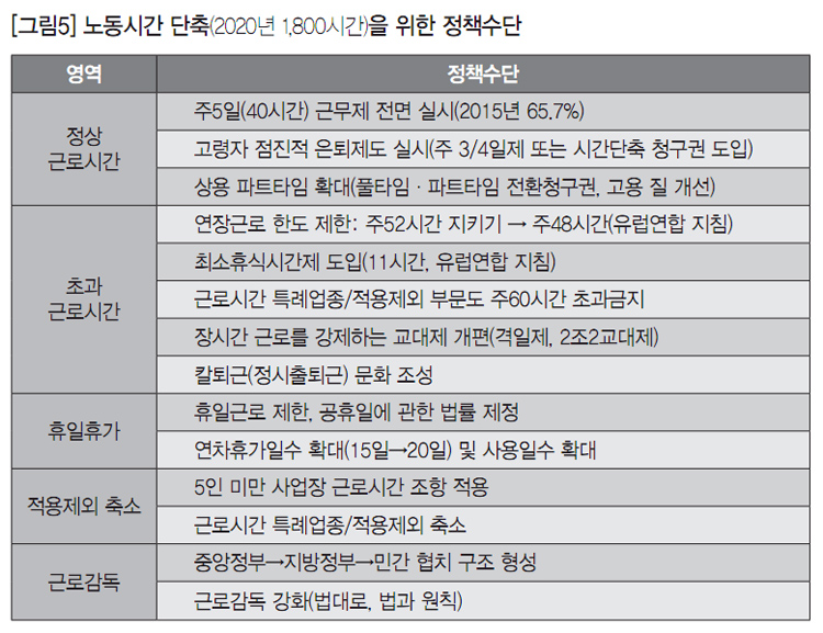 2014년 OECD 회원국 평균 노동시간은 연간 1,770시간이다. 따라서 ‘2020년 1800시간’은 우리 사회에서 합의된 노동시간 단축목표라 할 수 있다. 하지만 최근 노동시간은 2,200시간대에서 더 이상 줄지 않고 있다. 노동시간 단축목표(2020년 1800시간)를 실현하려면 앞으로 5년 동안 매년 노동시간을 80시간씩 단축해야 한다. 이를 위해서는 실현가능한 정책수단을 구체화하고 종합적으로 점검하고 추진해야 하는데, 노동시간 단축목표와 정책수단을 요약하면 [그림5]와 같다.
