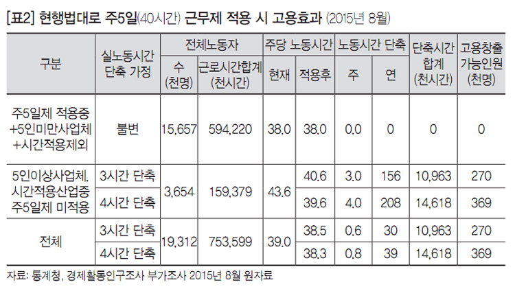 현행법 상 주5일(40시간) 근무제를 적용받아야 함에도 아직 적용받지 못 하고 있는 노동자는 365만 명(전체 노동자의 18.9%)이다. 법대로 주5일 근무제가 적용되면, 이들의 노동시간은 주3~4시간(연 156~208시간) 단축되고, 새로운 일자리를 27~37만개 만들 수 있다. 이 때 전체 노동자의 노동시간은 주0.6~0.8시간(연 30~39시간) 단축된다([표2] 참조).