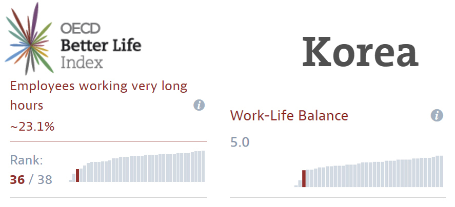 (OECD가 발표한 '2016년 더 나은 삶 지수'에서 한국은 장시간 노동 순위와 일과 삶의 균형 부문에서 조사대상 38개국 중 36위를 차지했다. ⓒOECD)