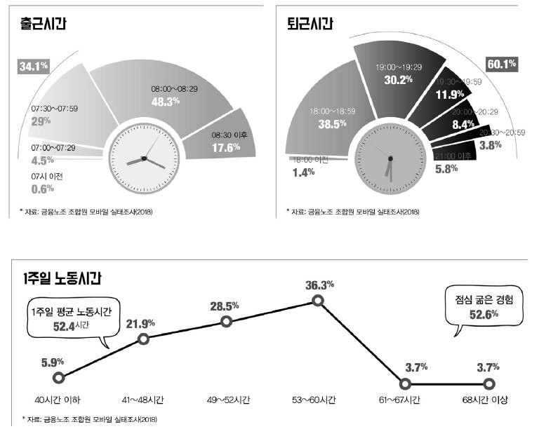 금융산업 노동자들의 총 노동시간을 기준으로 볼 때 몇 가지 특징적인 현상도 확인된다. 첫째, 금융산업 노동자들의 82.4%가 오전 8시 30분 전에 출근하고 있으며(오전 8시 이전 출근 34.1%), 퇴근은 60.1%가 오후 7시 이후에 하고 있다(오후 8시 이후 퇴근 18%). 금융산업 노동자들은 직장에 머무르는 시간은 약 11시간이나 된다. 둘째, 금융산업 노동자들은 직장에 출근하고, 퇴근할 때까지 휴게시간 60분 정도를 제외하면 약 11시간 정도 일을 하고 있다. 그러나 1주일 평균 12.4시간 정도 연장근무를 하면서 연장근로 미보상율은 94.4%(미보상 11.1시간)나 된다.